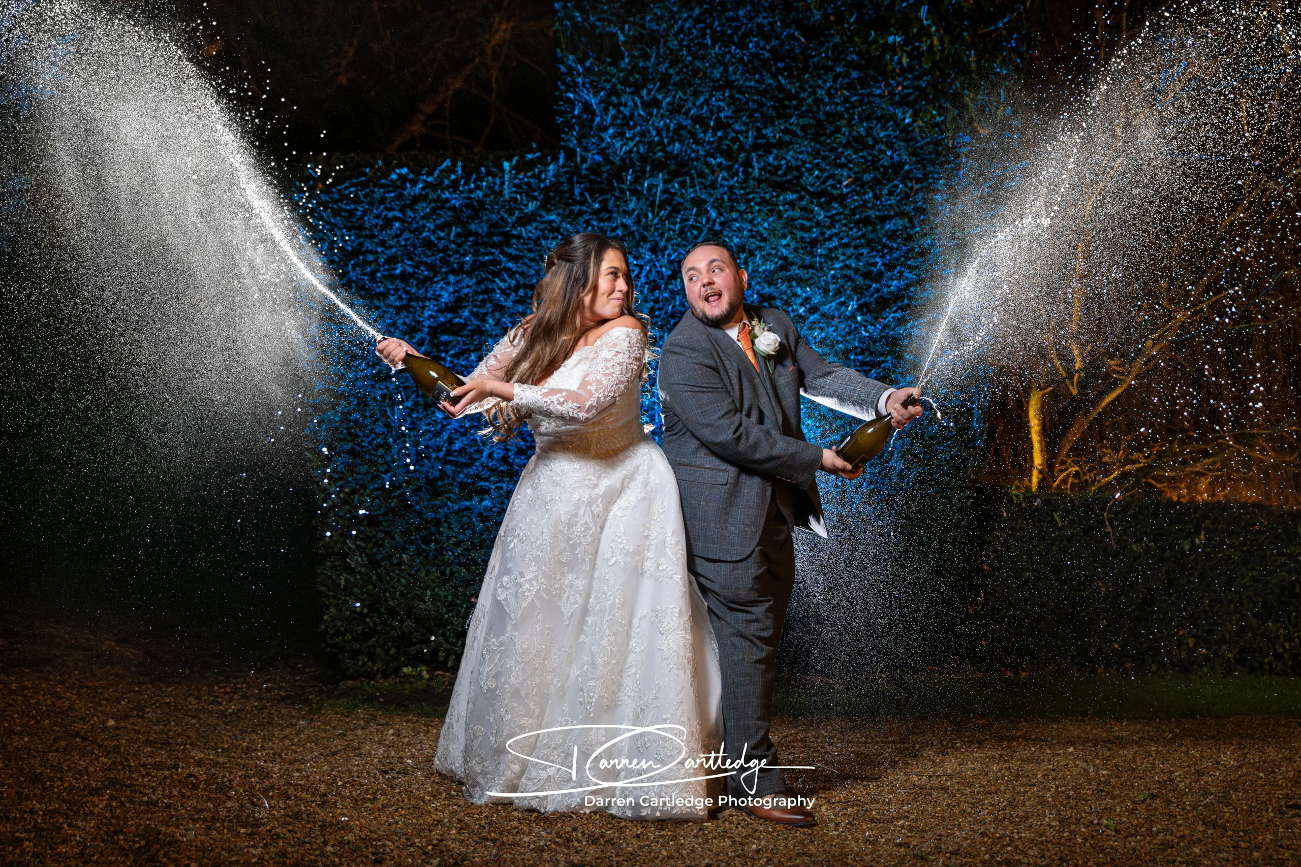 Twilight is a magical part of the day. Using off-camera flash, I capture cinematic, romantic images — from couple portraits to champagne sprays, sunsets, and silhouettes. Couples who include this in premium packages get truly unforgettable evening photographs.